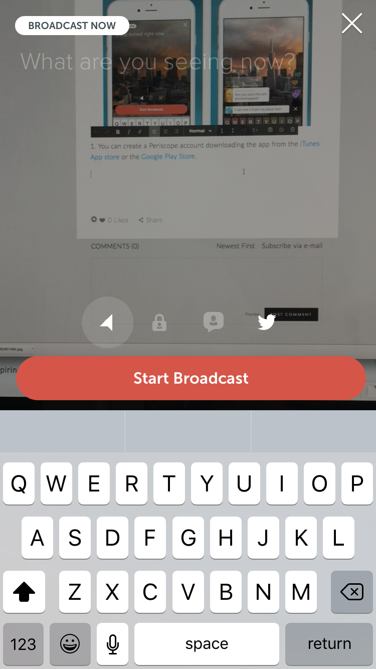 4. To start a broadcast, select the camera icon. Choose wether to share your location, share to Twitter and to enable / disable comments and questions. Give your broadcast a name.