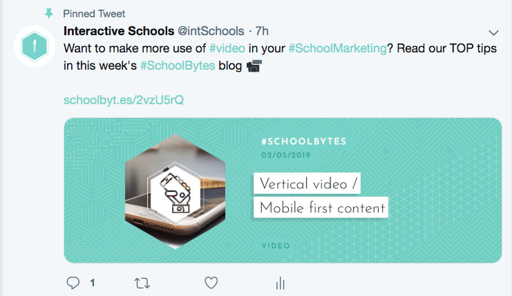 Pin a Tweet: Got an open day coming up or a school event? Has the head just shared a new blog, or has there been a great achievement in the school? Use Twitter’s Pin feature to make sure this tweet always appears at the top of your feed.