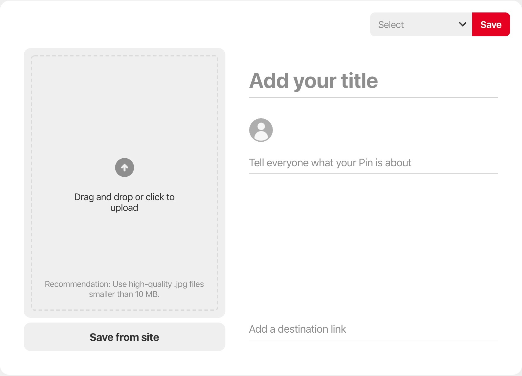 Follow the steps to upload your Pin or enter a URL in “Save from site” if you are looking to create a Pin from a website.