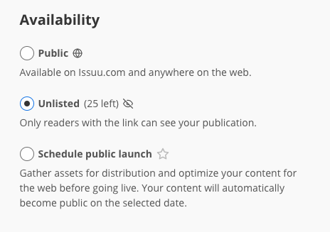 Uploaded your publication but only want a specific audience to view it? No problem! Simply set your publication as unlisted and only those with links can view your publication. This could then be sent out in a parent newsletter or to a select audience to make sure only those that you want to view it, can view.