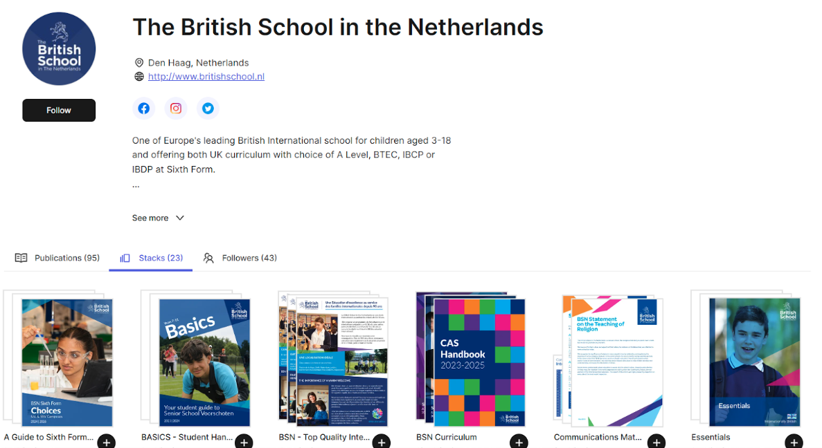 Issuu is a place for all your school documents allowing easy viewing and sharing. We recommend this platform is used and managed by the marketing department as a lot of your documents will be part of wider marketing assets.
