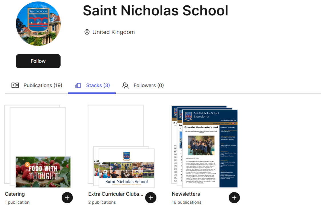 Multiple publications can also be grouped by ‘Stacks’ that can be embedded into your Interactive Schools website and can make it easier for your audience to navigate through your content.