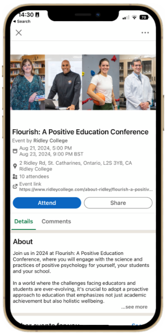 Utilising this feature allows you to organically promote events such as open days whether it is in-person or online. In the example below @RidleyCollege are using this feature to promote an education conference. You can also run paid advertising campaigns on these events to help them reach an even wider audience.