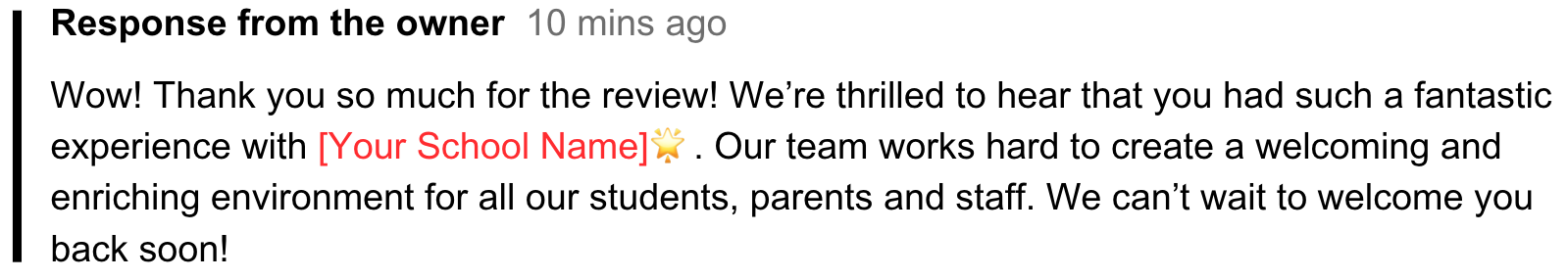 Responding to Google Reviews is more than just a box-ticking exercise—it's an opportunity to showcase your school's values, commitment to excellence, and dedication to customer satisfaction. Always endeavour to embrace every review with open arms, charm, and personality.