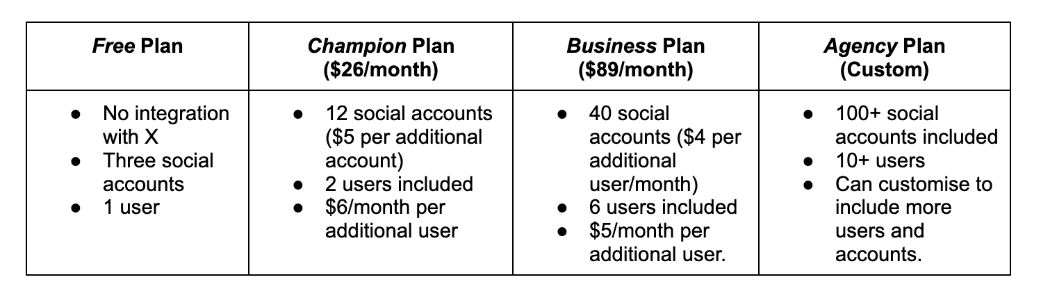 While the lack of integration with X on the Free Plan is less than ideal, plans upward from Champion are more than suitable for schools with a medium to large Marketing Team. The easy affordability of Champion and the ability to add users for only $6 a month results in this being our top recommended multi-user plan.